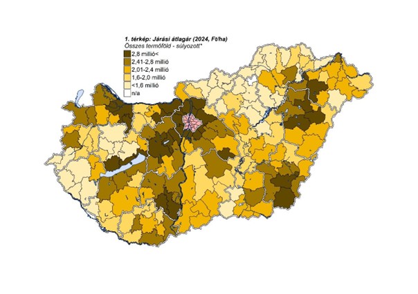 A legdrágább termőföld átlagár 2024-ben Pest vármegyében volt 2,833 millió forintos hektárárral, s még Hajdú-Bihar és Tolna lépi át a 2,7 milliós szintet. Továbbra is a nógrádi földek a legolcsóbbak; egyedül itt nem éri el az 1,4 millió forintot az átlagos hektárár