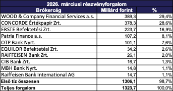 A befektetési szolgáltatók versenyében a WOOD & Company diadalmaskodott, 389,3 milliárd forintos forgalmának köszönhetően. A Concorde 378,3 milliárd forintos forgalma a második helyre volt elegendő, míg az ERSTE 223,7 milliárd forint értékű forgalmat bonyolított, ezzel a dobogó harmadik fokára állhatott fel.