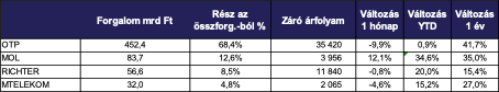 A blue chipek közül továbbra is az OTP Bank papírjaival zajlott a legnagyobb értékű kereskedés, 452,4 milliárd forinttal, ami a teljes részvénypiaci forgalom 68,4 százalékát adta. A második helyen a MOL végzett 83,7 milliárd forinttal, az olajtársaságot követte a Richter Gedeon 56,6 milliárd forintos értékkel. A közepes kapitalizációjú kibocsátók közül a Shopper Park Plus érte el a legnagyobb, mintegy 8,8 százalékos árfolyamnövekedést.