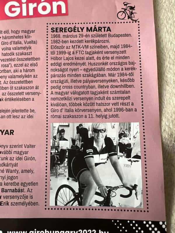 Seregély Márta a magyar országúti kerékpársport egyik meghatározó alakja. A 22-szeres magyar bajnok, a Ferencvárosi Torna Club örökös bajnoka és a Magyar Kerékpáros Szövetség örökös bajnoka nemcsak versenyzőként, hanem edzőként és sportvezetőként is ismert. Versenyzőként 6 női Giro d'Italia-t teljesített a magyar női válogatottal, és ekkor ismerkedett meg Giovanni Pinarello-val is, aki mindig valami kis meglepetést adott a magyar versenyzőknek ajándékba, hol zoknit, hol kesztyűt vagy sapkát.