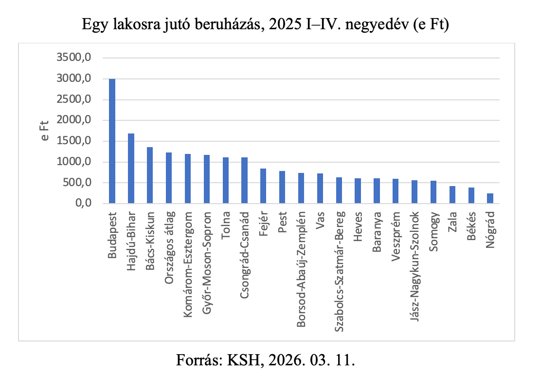 A beruházásokkal összefüggő fontos adat az egy lakosra jutó építőipari termelés, amelynek esetén hasonló aránytalanságok láthatók. 2025. I–IV. negyedévében az egy lakosra jutó építőipari tevékenység Budapesten 7,3-szorosa volt a nógrádi, és 5,2-szerese a vasi értéknek.