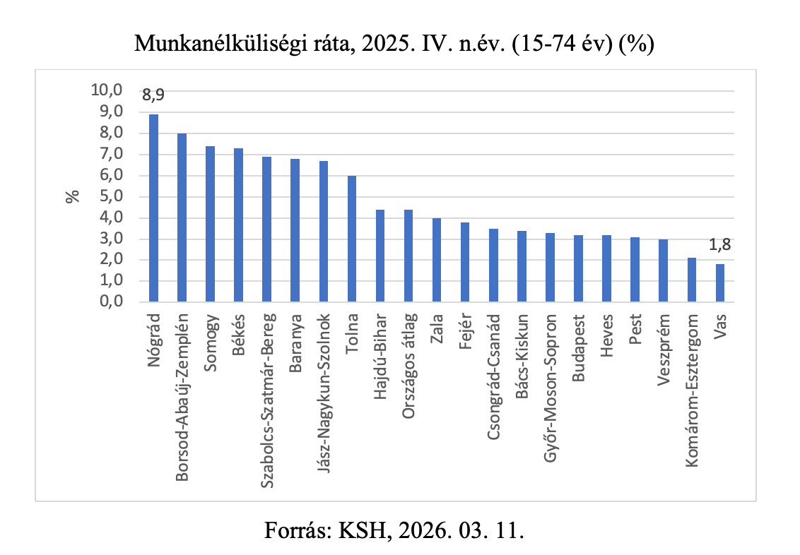 Az ábrán látjuk a jelentős különbséget a Vas vármegyei 1,8 és a Nógrád vármegyei 8,9 százalékos munkanélküliségi adat között.