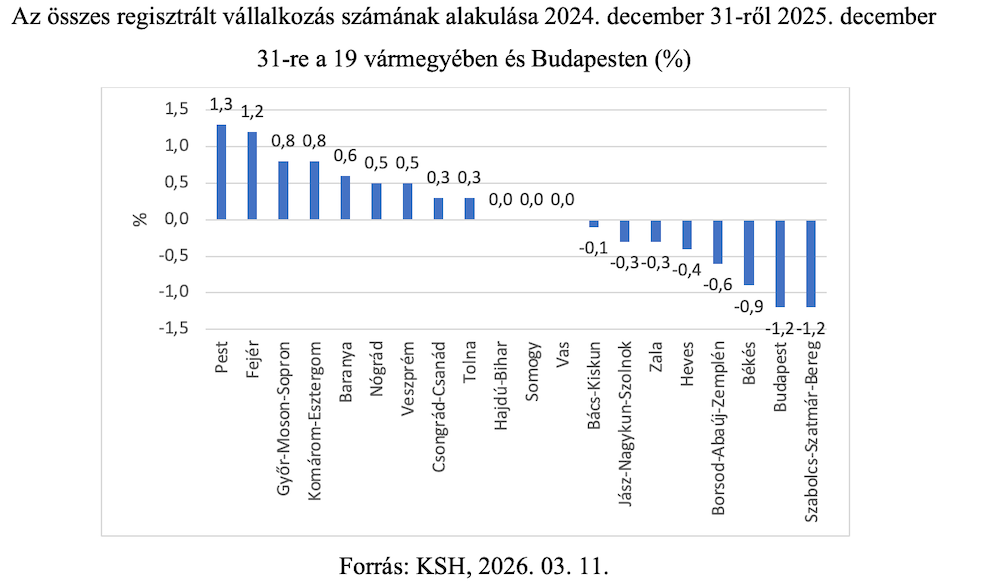 a 19 vármegye és Budapest figyelembevételével 8 esetben csökkent, 3 esetén változatlan maradt a vállalkozások száma 2024-ről 2025-re.