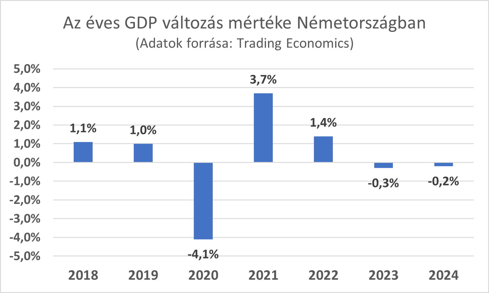 A német gazdaság már 2020 előtt sem produkált jelentős növekedést, azonban a pandémia utáni felpattanás 2021-2022-ben biztató volt. Az energiaválság, az ellátási láncok rendellenességei, az ukrajnai háború következtében jelentkező piaci zavarok és a globális gazdaság turbulens változásai 2023-2024-ben visszalökték ezt a növekedést egy stagnálás körüli, minimálisan csökkenő szintre.