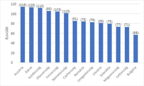 egyik V4-es ország értéke sem éri el az EU-s átlagot, bár a cseh érték a közelében jár (91 százalék).