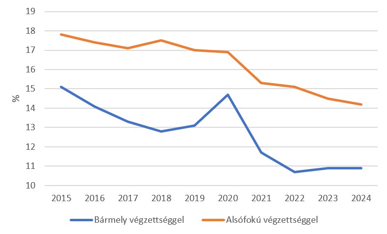 1. ábra. A se nem tanulók, se nem dolgozók arányának alakulása Magyarországon a 15-29 éves korcsoportban bármely végzettség, illetve alsófokú végzettség esetén (2015-2024, %); Forrás: 2025.04.14.