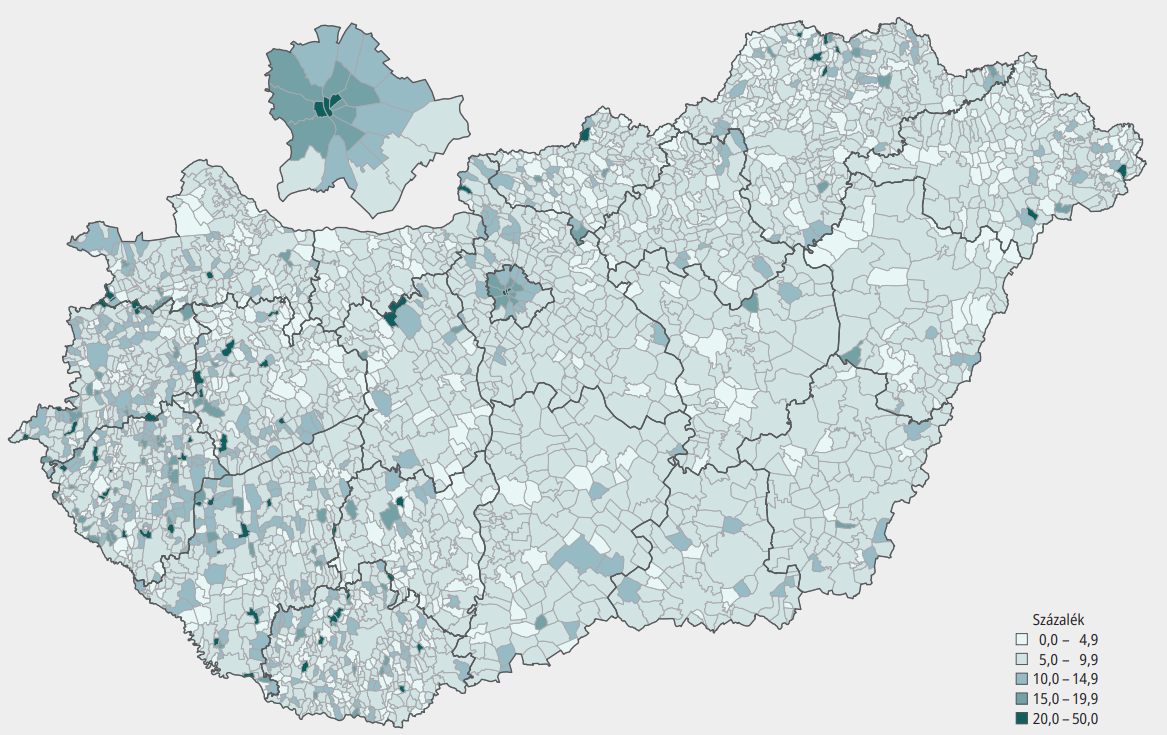 A gyermektelen nők aránya különösen magas Budapest belső kerületeiben. Szintén kiugró a gyermektelenek aránya a Nyugat-Dunántúlon, valamint számos kistelepülésen. Utóbbit az aprófalvak alacsony esetszámai magyarázhatják.