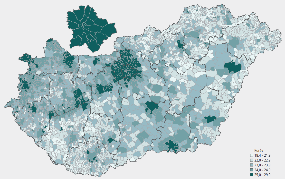 A 15 éves és annál idősebb nők átlagos életkora első gyermekük születésekor Magyarország településein, 2022