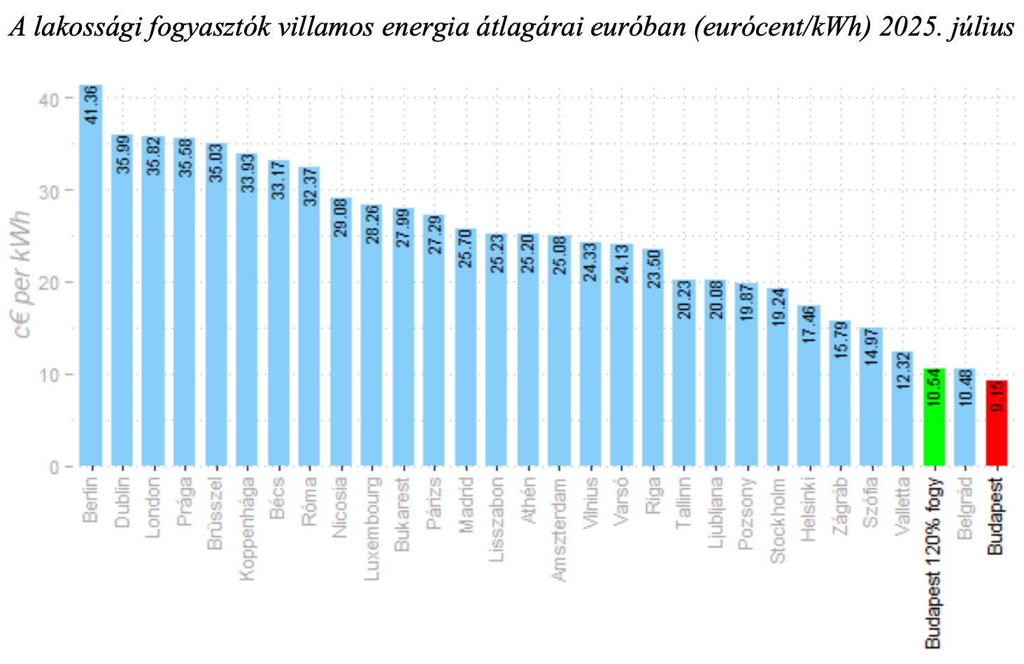 A jelentés szerint Budapesten júliusban 9,15 eurócentbe került egy kilowattóra áram, amellyel Magyarország a teljes mezőny legalacsonyabb árát kínálta.