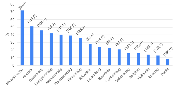 Az ábra szerint az EU-s átlag innovációs index értéket (100) jelentősen meghaladó innovációs index értékű Svédország, Hollandia, Írország vagy Dánia esetén a kedvezményes állami forráshoz jutó cégek aránya csekély. De ezt látjuk Csehország esetében is, amelynek innovációs index értéke 11,1 százalékponttal magasabb a magyarnál, miközben - a magyar 72 százalékos arányhoz mérve - csupán a cégek 21 százaléka kapott bármilyen kedvezményes állami forrást.