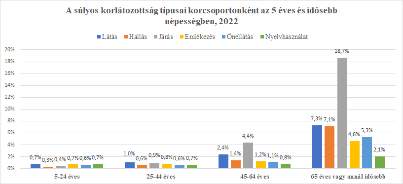 Összességében a súlyosan korlátozottak aránya az 5–44 éves korosztályban 3%, a 45–64 éveseknél már 8%, a 65 év felettieknél pedig 26%.