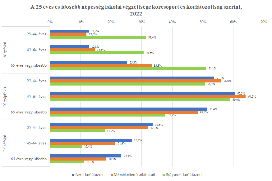 Ez a különbség különböző mértékben, de minden korcsoportban megfigyelhető. A 25–44 éves súlyosan korlátozottak közt a nem korlátozottakhoz képest feleakkora a felsőfokú végzettségűek aránya, viszont két és félszeres azok aránya, akik csak alapfokú végzettséget szereztek. A mérsékelten korlátozottak iskolázottsága sokkal közelebb áll a nem korlátozott népességhez, és a fiatalabb korcsoportok felé csökken a különbség közöttük. A munkaképes korúak között a nem korlátozottakhoz viszonyítva kissé alacsonyabb a felsőfokú végzettségűek, ugyanakkor magasabb a középfokú végzettségűek aránya.