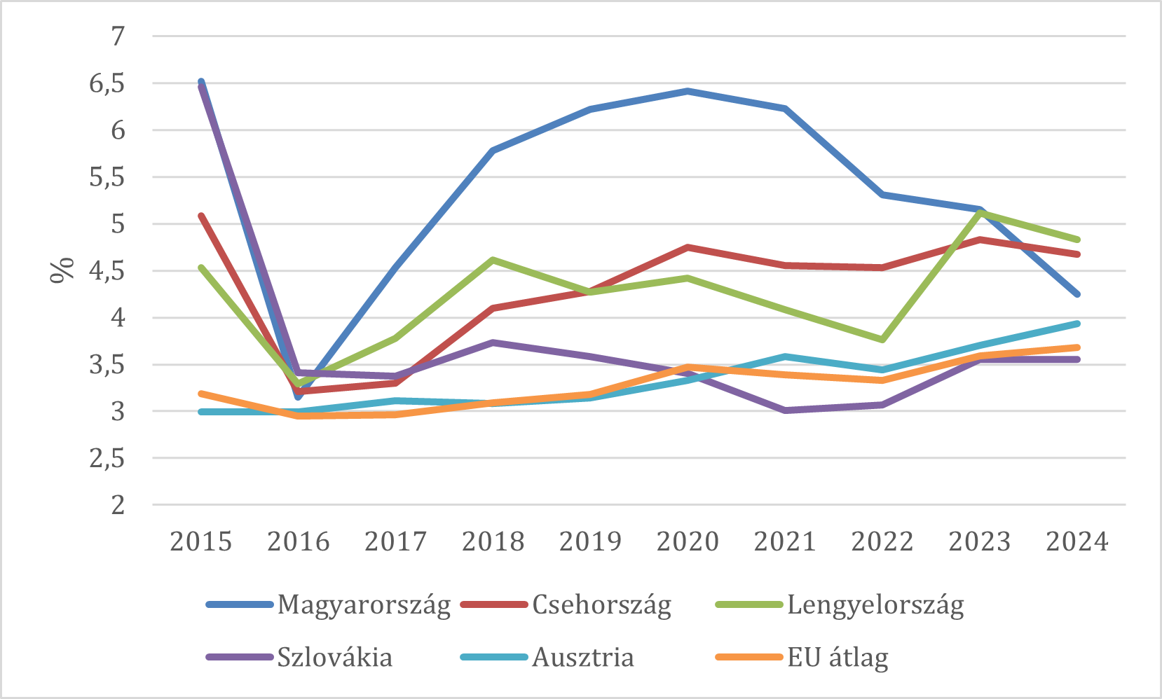 Az 1. ábrán azt látjuk, hogy a hazai állami beruházási ráfordítások GDP-hez viszonyított aránya a vizsgált országok között – két év kivételével – a legmagasabb, és az EU-s átlaghoz viszonyítva is kiugróan nagy. A két év közül az egyik a 2024-es esztendő, ahol a csökkenés jelentős volt. A szlovák érték a 2015-ös évi kiemelkedő adat után végig alacsony, igaz nem rosszabb az EU-s átlagnál.