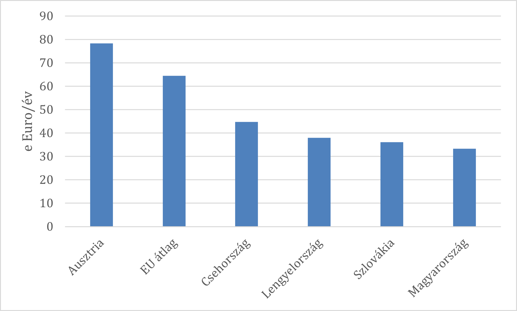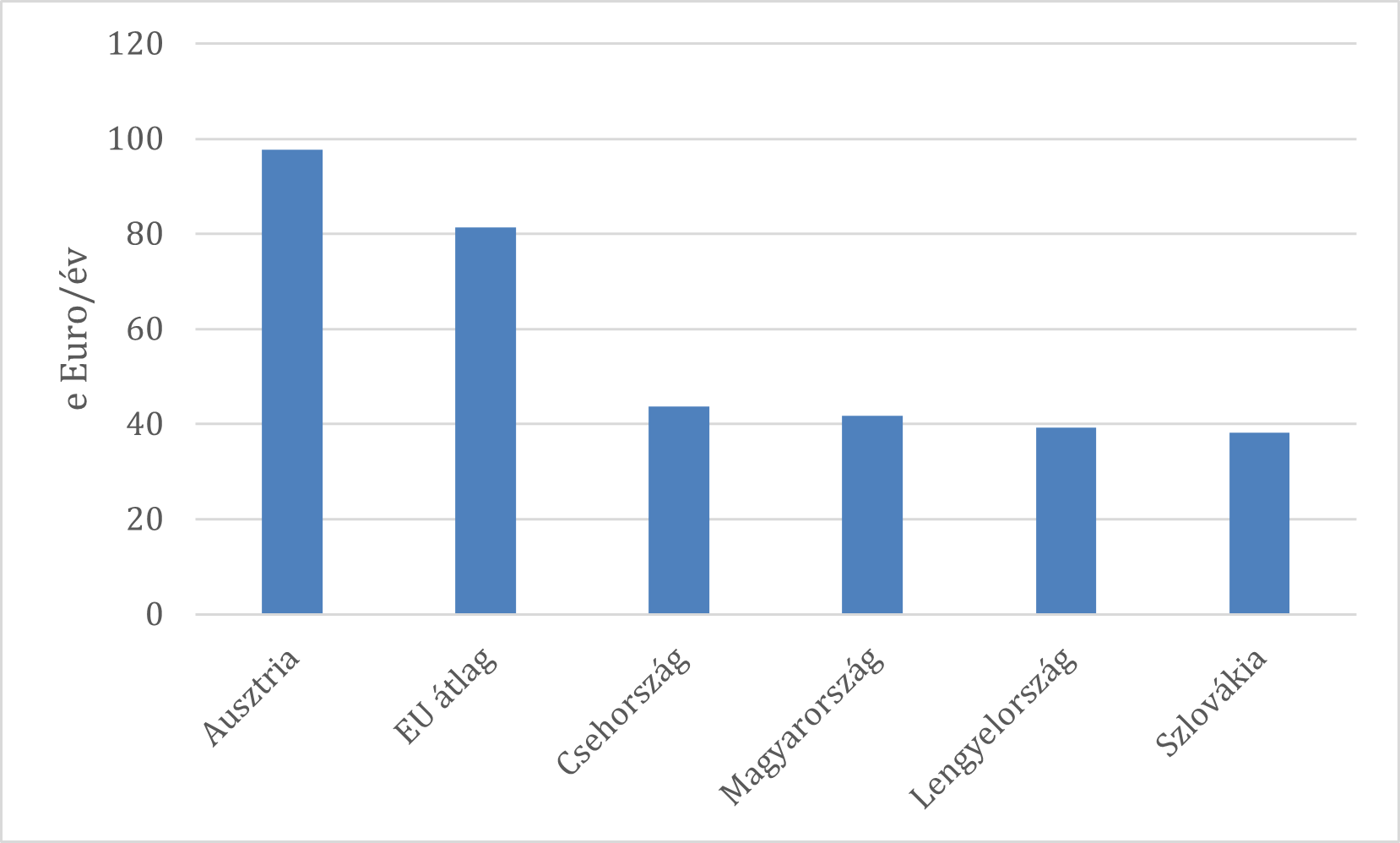 Az egyik jól használható termelékenységi mutató az úgynevezett tényleges termelékenység, amely az egy foglalkoztatott által egy adott évben előállított hozzáadott értéket méri ezer euróban megadva. Az Eurostat adatai csak a 2021-2023 közötti időszakra állnak rendelkezésre. Ezekre az értékekre már hatással kellett lenniük a 2015-2020. évi beruházásoknak. Nézzük meg ezért, hol tartanak a vizsgált országok e két mutató esetében, 2023-ban.