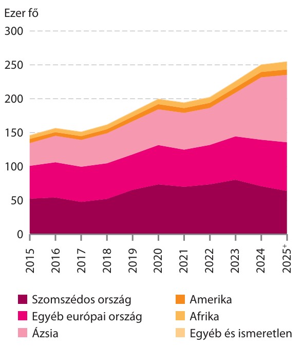 Az elmúlt tíz évben láthatóan elkezdett növekedni a nálunk élő ázsiaiak aránya. Beszédes, hogy míg 2015-ben a Magyarországon élő külföldiek 36%-a valamelyik szomszédos ország állampolgára volt, addig idén ez az arány már csak 25% volt. Jelenleg a külföldiek 39%-a Ázsiából, 5%-uk Afrikából, 3%-uk az amerikai kontinensről származik. Miközben nálunk tartozkodó európai országok állampolgárainak aránya jelentősen csökkent az elmúlt 10 évben (69%-ról 53%-ra), az ázsiaiaké folyamatosan növekedett (23%-ról 39%-ra). Az ázsiai kontinensről származók létszáma 2013 és 2025 között 27 ezerről közel 100 ezer főre nőtt.