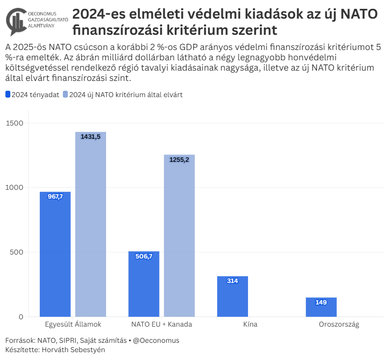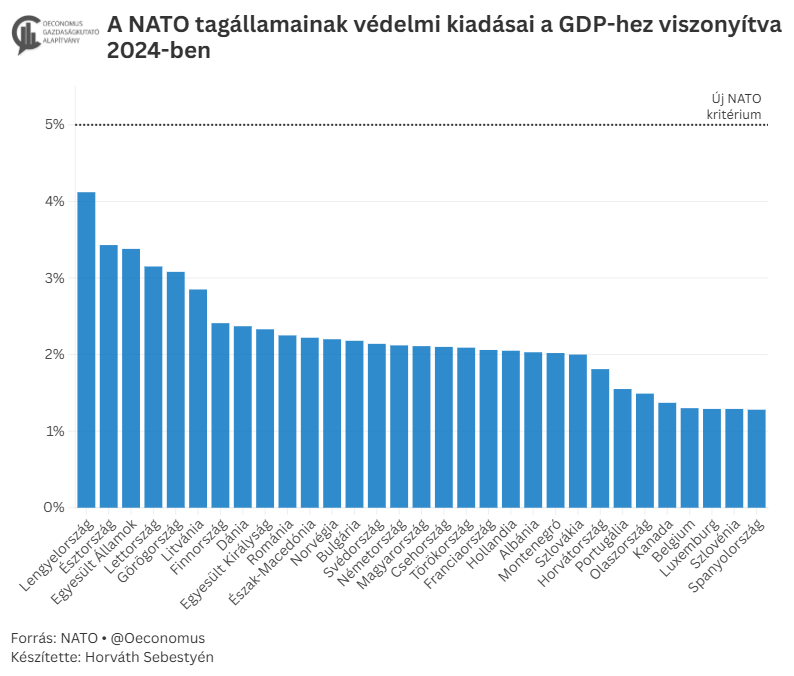 2024-ben egyik NATO-tagország sem érte el a 5 százalékos szintet. A legmagasabb, 3,5%-os GDP-arányos katonai kiadással Lengyelország rendelkezett. Az új elvárások alapján a szövetség védelmi költségvetése elérhette volna a 2868 milliárd dollárt, szemben a tavalyi 1474,4 milliárd dollárral.