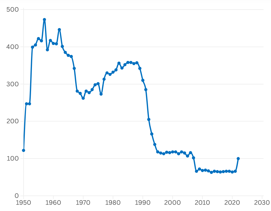 Európában állomásozó aktív szolgálatot teljesítő amerikai katonák számának alakulása 1950-2022 között (ezer fő)