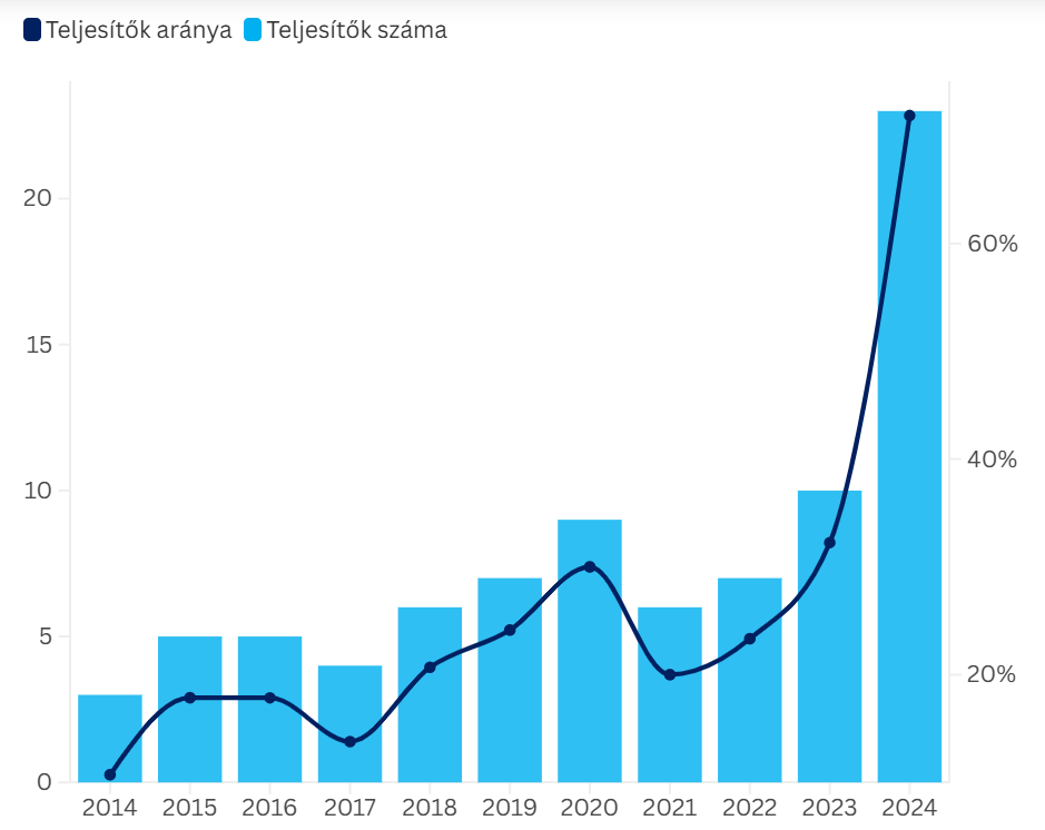 Az amerikaiak Európával szembeni elégedetlensége évtizedes történet, Barack Obama elnök második ciklusa alatt többször intézett kedvesnek tűnő, de rejtve tettekre ösztönző beszédet európai szövetségeseinek. Az európai védelmi kiadások növelése a kétezres évek óta kiemelt cél, a GDP két százalékára vonatkozó kiadási küszöbértéket végül a demokrata elnök második ciklusa alatti, 2014-es walesi NATO-csúcson határozták meg. Az alábbi ábrán szemléltettük, hogyan változott a finanszírozási kritérium megalkotása óta az azt teljesítők száma és aránya.