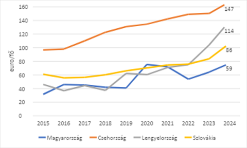Az 1. ábrán a V4 országok ráfordításainak alakulását látjuk 2015 és 2024 között.