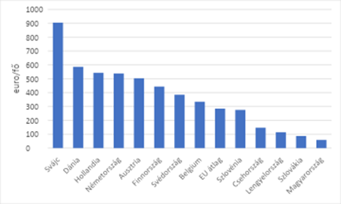 A legmagasabb egy főre jutó értéket Luxemburgban (759,2 euro) és Dániában (586,8 euro) találjuk. A legkevesebbet pedig Romániában (19,1 euro), Bulgáriában (38,3 euro) és Magyarországon (58,7 euro) látjuk. Magyarország ezzel az értékkel 2024-ben az EU-ban 25. helyen van. Csehország a 16., Lengyelország a 20. és Szlovákia a 21. Meg kell azt is említeni, hogy az egy főre jutó értéket befolyásolja a népességváltozás. Fogyó népesség esetén – mint például Magyarországon – az érték még magasabbnak is tűnhet.