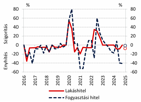 Megjegyzés: A szigorítást és enyhítést jelző bankok arányának különbsége piaci részesedéssel súlyozva. Előrejelzés 2025 első félévére. Forrás: MNB - Inflációs Jelentés, a bankok válaszai alapján