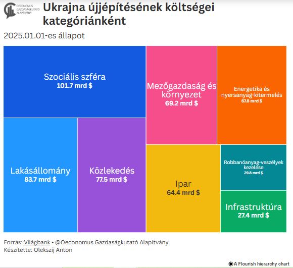 A teljes helyreállítási költség – amely magában foglalja a közvetlen károk helyreállítását, a gazdasági veszteségek kompenzálását, a termelési kapacitások visszaállítását és a társadalmi rendszerek újjáépítését – a Világbank becslése szerint 524 milliárd dollárra tehető a következő tíz évre. Ez az összeg dinamikusan változhat, hiszen a háború elhúzódása vagy új infrastrukturális célpontok támadása tovább növelheti a károkat.
