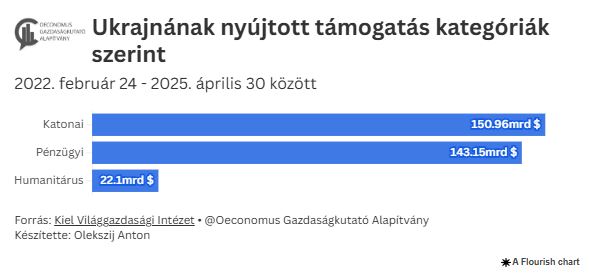 A német Kiel Világgazdasági Intézet szerint a 2022. február 24-e és 2025. április 30-a közötti időszakban nyújtott nemzetközi segítség teljes összegének mintegy 48%-a katonai, 45%-a pénzügyi segítség és 7%-a humanitárius jellegű volt, de ezen belül három év alatt a helyreállításra elkülöníttett becsült összeg nem éri el a 15 mrd eurót.