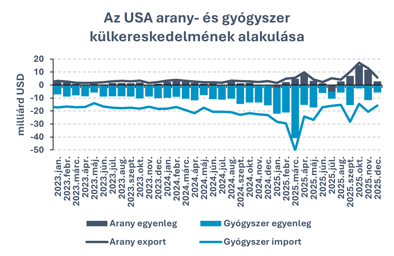 Ezt a bejelentést jócskán árnyalja, hogy a vámok okozta bizonytalanságon túl technikai hatások is hozzájárultak a hiány átmeneti mérséklődéséhez. Ugyanis a fokozódó vámfenyegetés hatására az USA gyógyszerimportja tavaly január és március között 20 milliárd dollárról 50 milliárd dollár fölé emelkedett, míg egyenlege -15 milliárd dollárról -41 milliárd dollárra ugrott, ezáltal érdemben hozzájárult a teljes mérlegben tapasztalt csökkenéshez. Az arany kivitele már a tavalyi év első hónapjaiban emelkedni kezdett és az év második felében a világpiaci ár növekedésével párhuzamosan tovább fokozódott. A folyamat tavaly októberben tetőzött, amikor a nemesfém kivitele meghaladta a 17 milliárd dollárt, a többlete pedig 15 milliárd dollár fölé emelkedett, tovább mérsékelve az USA külkereskedelmi hiányát. Az aranyat és gyógyszereket nem tartalmazó adatok alapján az USA kereskedelmi deficitje tavaly márciusban 136 helyett 100, októberben pedig 28 helyett 41 milliárd dolláron alakult, így már ezen két tétel hatásának figyelembevétele is a fenti 78 százaléknál jóval kisebb, 59 százalékos egyenlegjavulást eredményezett volna.