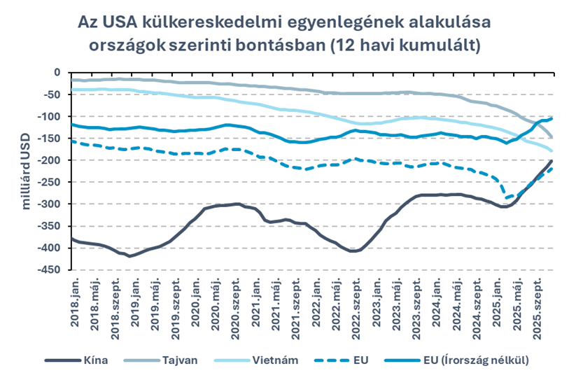 A Kínára kivetett amerikai vámok mérséklésén, illetve átmeneti felfüggesztésén túl a bilaterális (kétoldalú) áruegyenleg érdemi javulása is hozzájárult a vámbevételek csökkenéséhez. Az USA Kínával szemben regisztrált 12 havi kumulált (összesített) deficitje a 2025 márciusi 305 milliárd dollárról tavaly decemberben 200 milliárd közelébe csökkent és az Európai Unióval szembeni egyenleg is érdemben javult. Különösen abban az esetben, ha Írország nélkül vizsgáljuk az adatokat, mivel az USA-val folytatott kétoldalú kereskedelem jelentős része az ott működő amerikai gyógyszergyárakhoz köthető. Ezzel párhuzamosan az USA hiánya folyamatosan növekszik azon országokkal szemben, amelyeket Kína feltehetően kerülőútként használ piacainak elérésére (például Vietnám), vagy exportjuk az amerikai AI beruházási boom chipek iránti keresletét szolgálja ki (Tajvan).