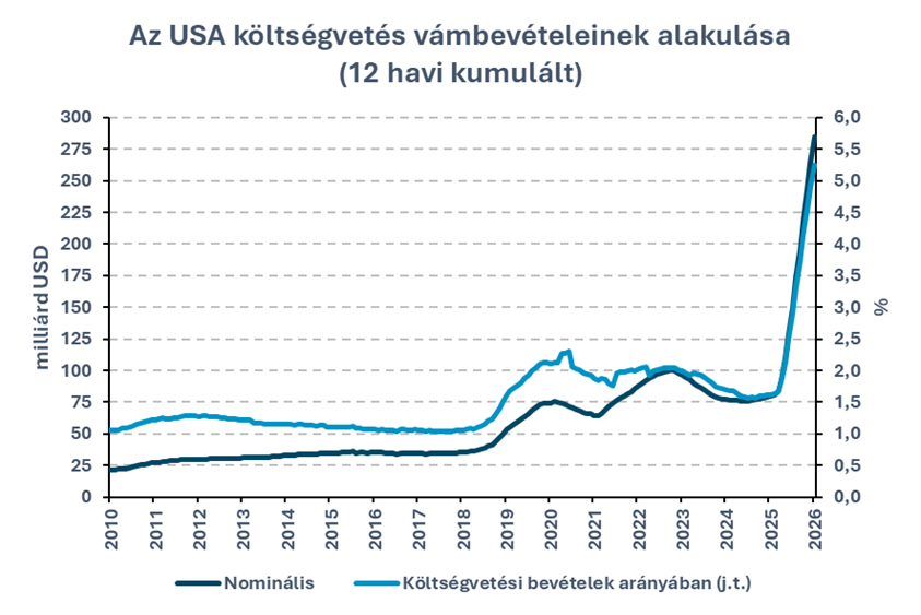 A reciprok (viszonosságú alapú) vámok tavaly áprilisi bevezetését követőn az USA szövetségi költségvetésének havi vámbevételei a megelőző időszakban mért átlagosan 7 milliárd dollárról rövid idő alatt 31 milliárd dollár fölé emelkedtek, majd a tavalyi év vége óta a 28 milliárdos szint közelében stabilizálódtak. A vámbevételek 12 havi összege tavaly októberben meghaladta a 200 milliárd dollárt, idén januárban pedig 284 milliárd dolláron alakult, így a költségvetési bevételeken belüli arányuk 5 százalék fölé emelkedett. Az érdemi növekedés ellenére a vámbevételek nem teszik lehetővé azokat a lépéseket, amelyekkel – többek között – Donald Trump a bevezetésüket indokolta. Továbbra is messze elmaradnak attól a szinttől, ami lehetővé tenné, hogy ezek segítségével kiváltsák a bevételek 50 százalékát kitevő személyi jövedelemadót, illetve, hogy nagyvonalú juttatások („vámosztalék”) fedezeteként szolgáljanak. Ráadásul a Legfelsőbb Bíróság hatályon kívül helyezte azokat a reciprok vámokat, amikhez az elmúlt időszakban realizált vámbevételek jelentős része köthető.