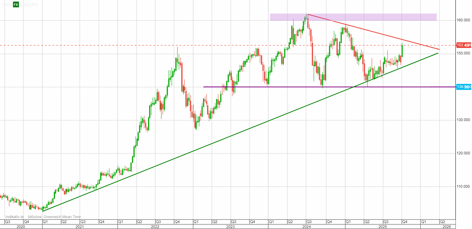 Tavaly áprilisban a japán pénzügyminisztérium a dollár-jen árfolyamának 160-as szintjének közelében aktívan beavatkozott. A devizatartalékból dollárt szabadítottak fel, és eladták a piacon. Ennek hatására hirtelen 154 közelébe erősödött vissza a jen árfolyama, majd idén januárban szintén a 160-as szint közelében fordult a jegyzés. Nemrégiben ismét fontos ellenállási szint került áttörésre 151-nél, mely már rövid távú támaszt jelent, a következő ellenállás pedig 154-155 között látható.