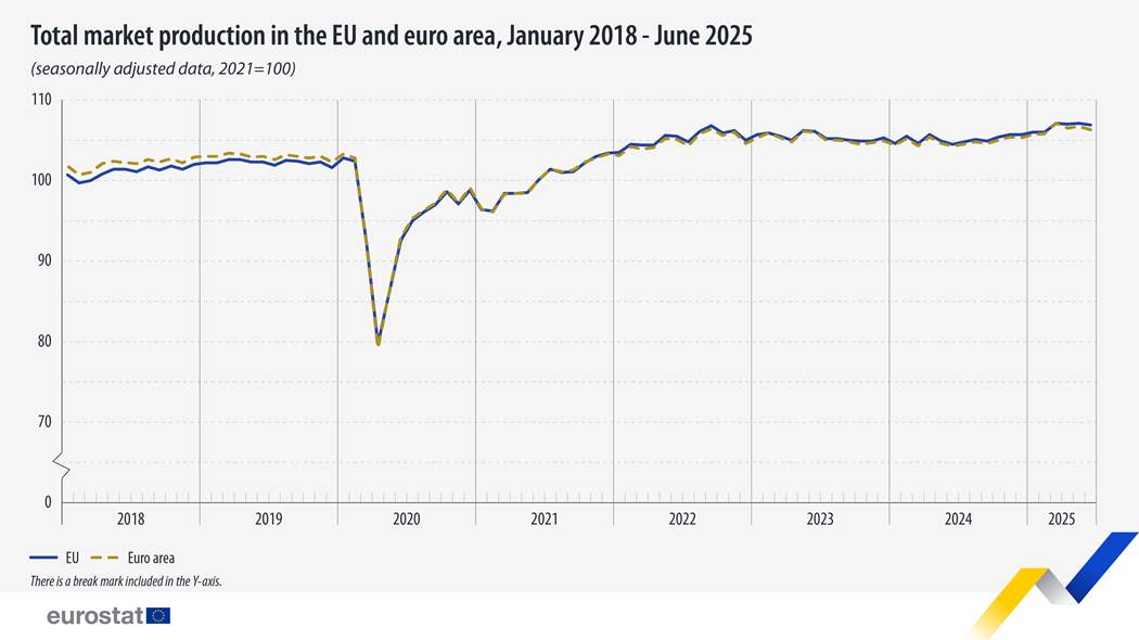 2025 júniusában a teljes piaci termelés az EU-ban 0,2 százalékkal, az euroövezetben pedig 0,4 százalékkal csökkent az előző hónaphoz képest – tette közzé az Eurostat.