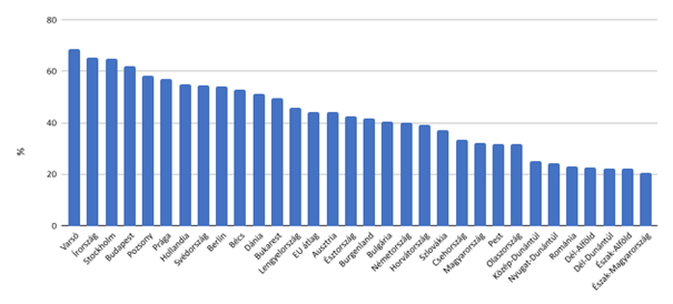 Ugyanakkor például a legalacsonyabb észak-magyarországi adat a budapestinek csupán 33,4 százaléka. A regionális szakadék tehát közel kétszeres. Miközben Budapest adata a V4-ek között Varsó után a második legjobb és az EU-ban is magasnak számít, a magyar régiók adatai mind jelentősen elmaradnak az EU-s értékektől és a 2030-ra kitűzött EU-s célértéktől is.