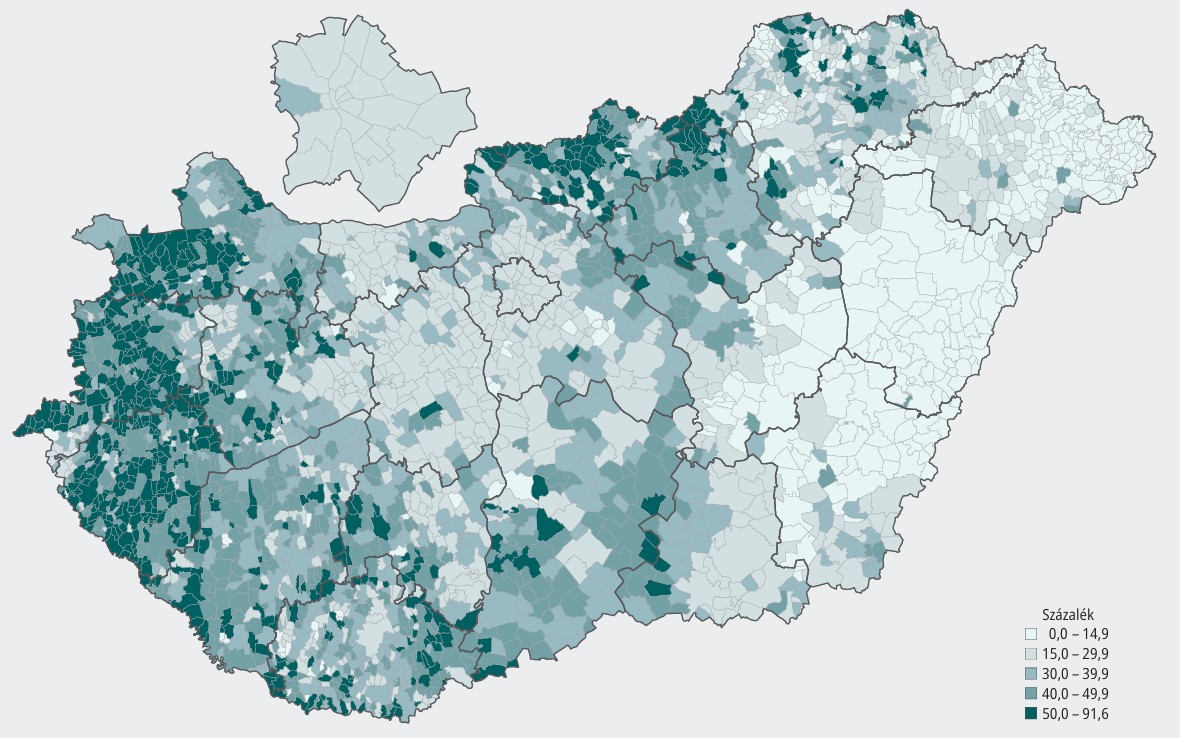 A felekezeten kívüliek aránya a teljes népességben Magyarország településein, 2022