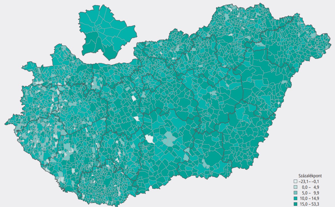 Ez a bővülés persze az országos átlagnál kisebb mértékű volt azokon a településeken, ahol már korábban is feszes volt a munkaerőpiac, miközben nagyobb mértékű emelkedés következett be a több munkaerőtartalékkal rendelkező, főképp északkeleti és délnyugati térségekben. Így is 2011 és 2022 között a települések döntő többségében, vagyis a 99 százalékában növekedett a foglalkoztatottak aránya. Közben a munkanélküliek száma 2011 és 2022 között több mint 334 ezer fővel, vagyis 59 százalékkal csökkent.