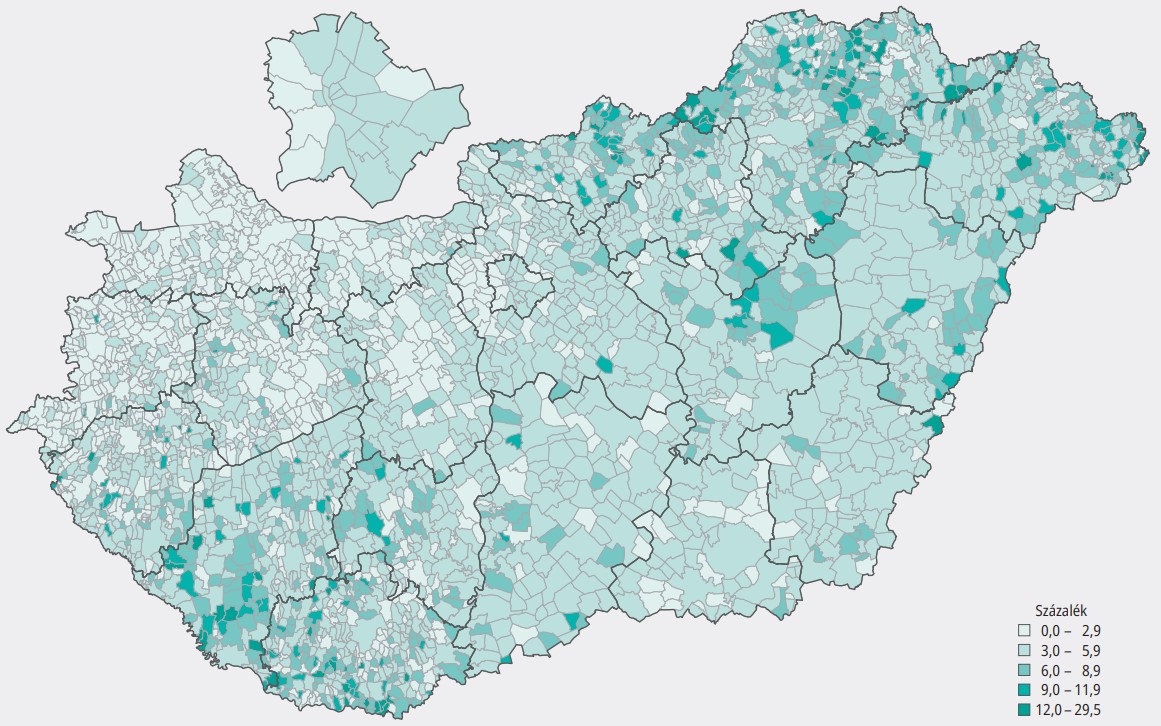 A munkanélküliek aránya a 15–64 éves népességen belül Magyarország településein, 2022
