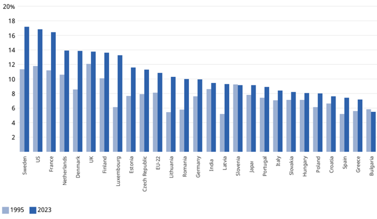 Az ábra arra is rávilágít, hogy 1995-ről 2023-ra a legjelentősebb tudásberuházás bővülés Luxemburgban, Svédországban, Dániában, Lettországban és Litvániában zajlott le. A magyar érték javulása minimális. Érdekes a csupán a 13. helyre elegendő német adat is, amelynek javulása szintén kicsi.