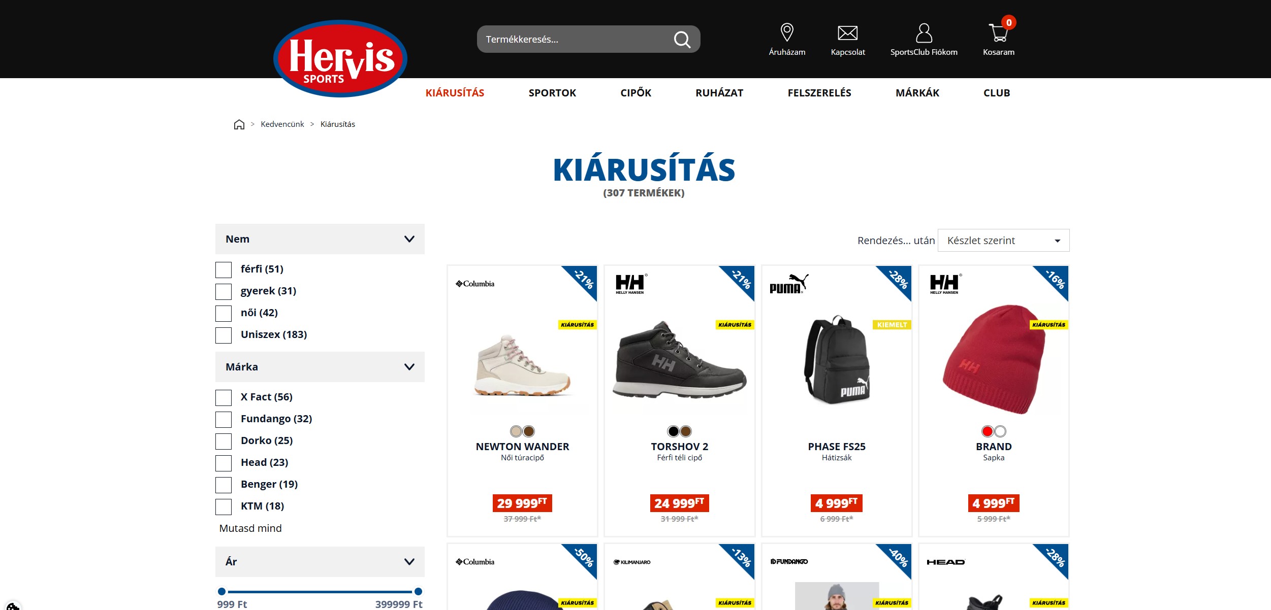 Képernyőkép az igazi Hervis webshopról, melynek elérhetősége: hervis.hu