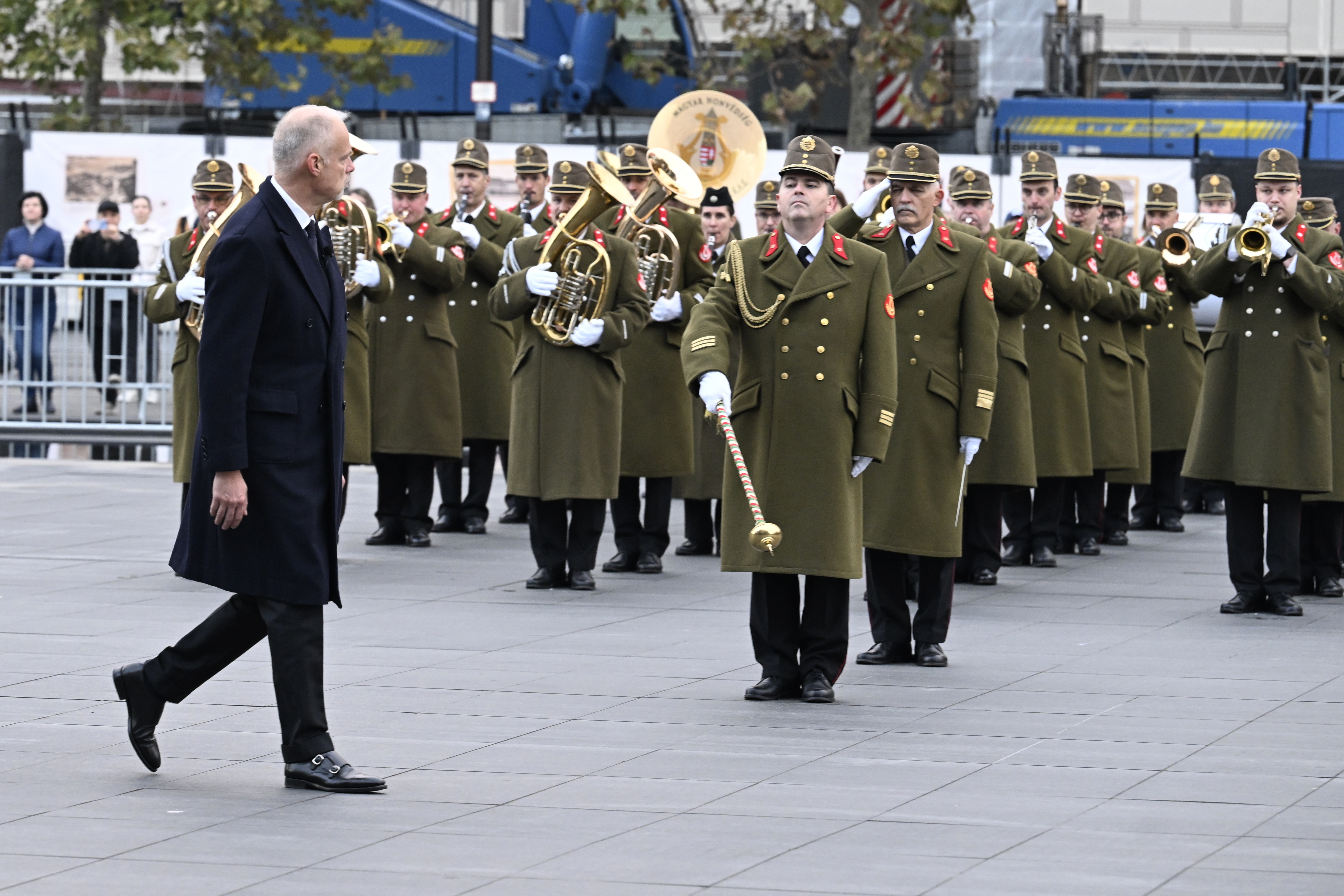 Szalay-Bobrovniczky Kristóf honvédelmi miniszter (b) és a díszegység tagjai az 1956-os forradalom és szabadságharc 69. évfordulóján az ünnepélyes zászlófelvonáson az Országház előtti Kossuth Lajos téren 2025. október 23-án. (MTI/Máthé Zoltán)