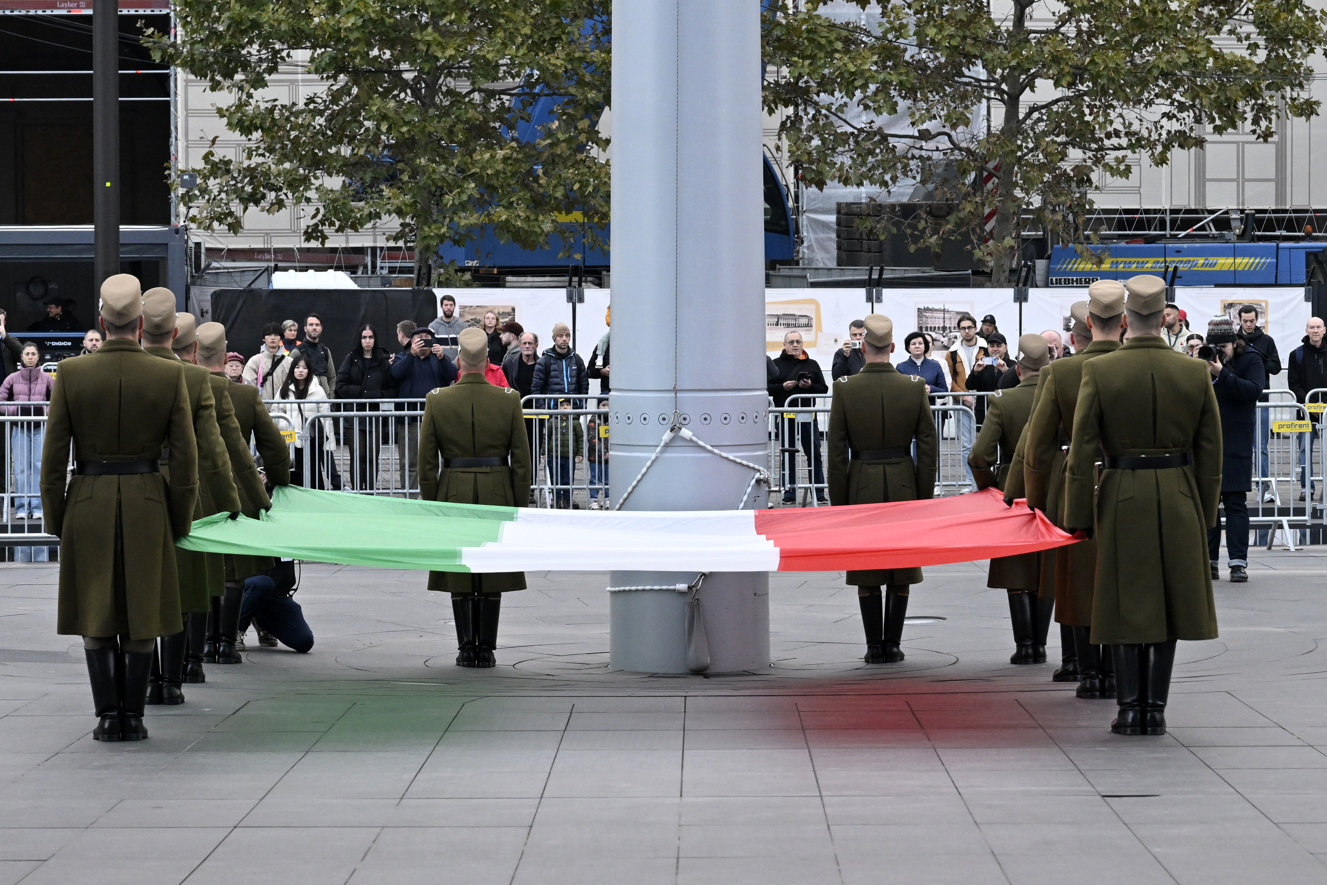 Katonai tiszteletadással felvonják a nemzeti lobogót az 1956-os forradalom és szabadságharc 69. évfordulóján az Országház előtti Kossuth Lajos téren 2025. október 23-án. (MTI/Máthé Zoltán)