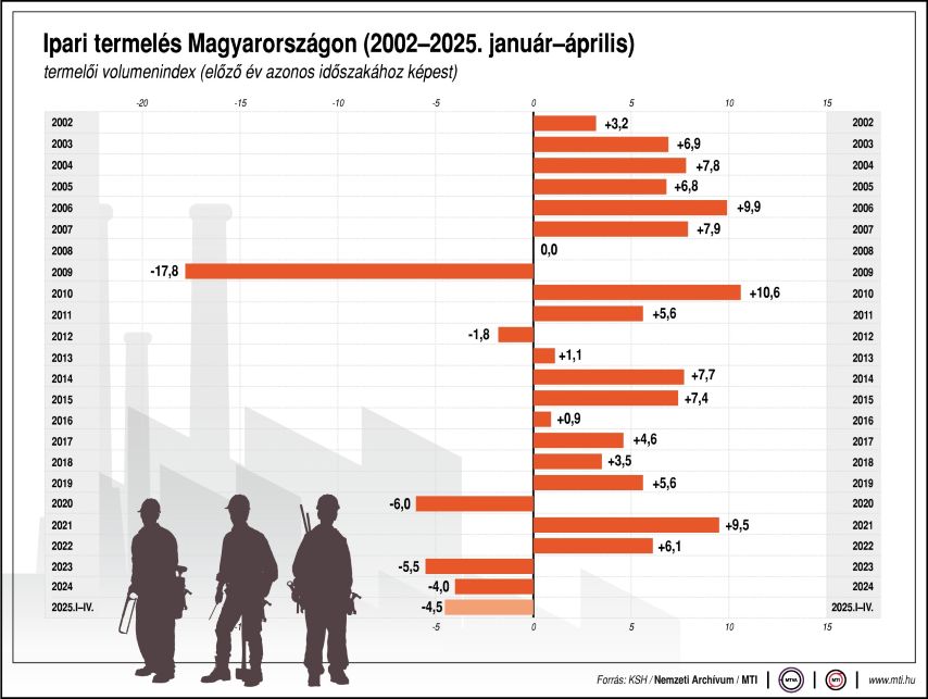 Az ipari termelés az év első négy hónapjában 4,5%-kal kisebb volt, mint 2024 azonos időszakában.A szezonálisan és munkanaptényezővel kiigazított ipari kibocsátás az előző hónaphoz képest 1,5%-kal nőtt.