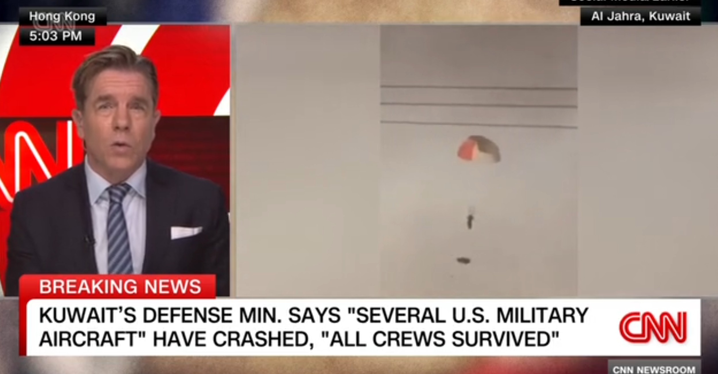 A CNN egy amatőr videofelvételt tett közzé egy falevélként zuhanó repülőgépről és egy ejtőernyősről, aki felhehetően a gép személyzetéhez tartozik.