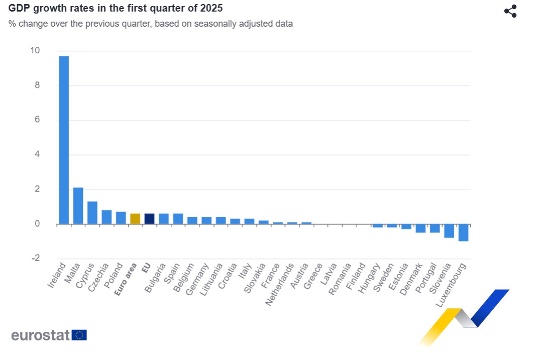 Az év első negyedévében szezonális kiigazítással az euróövezetben a bruttó hazai termék (GDP) 0,6 százalékkal nőtt a tavalyi utolsó negyedévhez képest. A május 15-én közzétett második becslésben kisebb mértékű, 0,3 százalékos első negyedéves növekedés szerepelt.