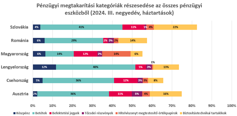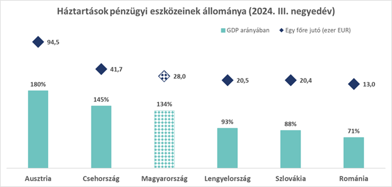 A GDP arányában 134%-ot tesz ki a magyar háztartások bruttó pénzügyi vagyona, ami Ausztria 180%-os mutatójától jelentős mértékben, Csehország 145%-os mutatójától csak kisebb mértékben marad el, ugyanakkor jelentősen előzi a 90% körüli értéket felmutató Lengyelországot és Szlovákiát, és csaknem kétszerese a 70%-nál alig magasabb romániai értéknek. Ami pedig a háztartások bruttó vagyonának egy főre jutó volumenét illeti, 28,5 ezer eurós értékkel Magyarország továbbra is harmadik a listán, arányában viszont a GDP-ben látottnál jóval jelentősebb a lemaradása a 94,5 ezer eurós osztrák, valamint a 41,7 ezer eurós cseh értéktől.