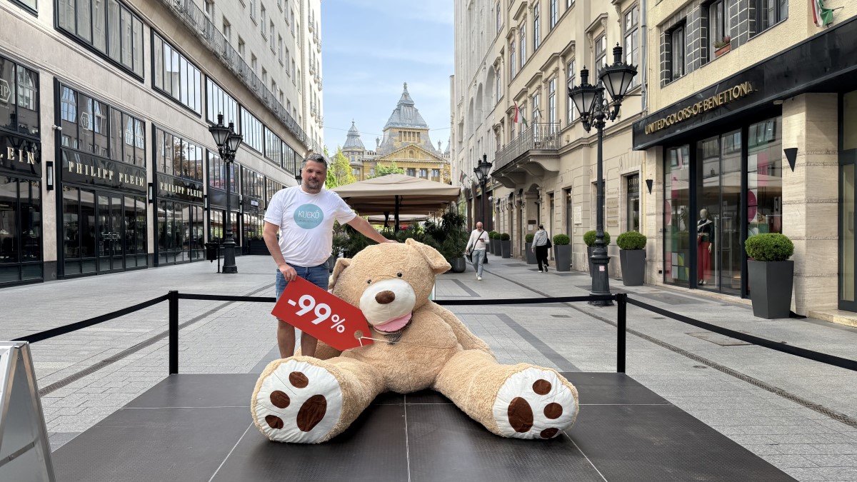 HírekGigantikus gyermekjátékkal találkozhat az, aki ma a budapesti Fashion Street környékén jár, amelyen egy 99%-os árengedményt sugalló címke is látható. A mackót valójában nem lehet megvásárolni és hazavinni, viszont még az árának egy százalékát sem kell kifizetnie annak, aki szeretné, hogy – racionális méretű és értékű, – sporteszközök és élmények tegyék szebbé a gyermekotthon lakóinak életét.