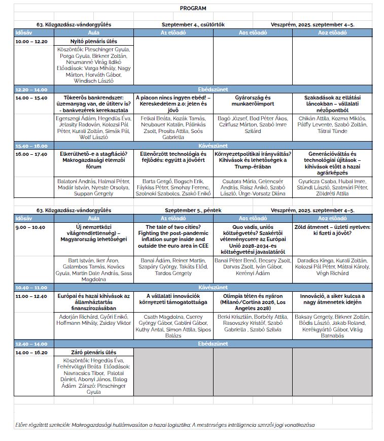 A konferencia plenáris előadásai és szekciói a magyar gazdaság helyzetének általános elemzésén túl olyan kihívásokra reflektálnak majd, mint az egyre nagyobb aggodalomra okot adó geopolitikai folyamatok gazdasági következményei; a Trump-kormányzat vám- és kereskedelempolitikájának hatása a világgazdaságra és a magyar vállalatokra; a mesterséges intelligencia okozta kihívások vagy éppen a klímaalkalmazkodással járó feladatok. A konferencia plenáris üléseinek előadói között ott lesz Varga Mihály jegybankelnök, Nagy Márton nemzetgazdasági miniszter, Navracsics Tibor közigazgatási és területfejlesztési miniszter, valamint a Költségvetési Tanács, az Állami Számvevőszék és a KAVOSZ elnöke is.