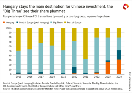 Magyarország tavaly 31 százalékos részaránnyal végzett az első helyen, míg a hagyományosan meghatározó szereppel bíró „nagy trió”, vagyis a Németország-Franciaország-Egyesült Királyság országcsoport a kínai beruházások csupán 20 százalékát szerezte meg. A régióba Kínából érkező közvetlen működőtőke-befektetések (FDI) összértéke 10 milliárd euró volt 2024-ben, ami 47 százalékos növekedés az egy évvel korábbihoz képest, és az első növekedés 2016 óta.