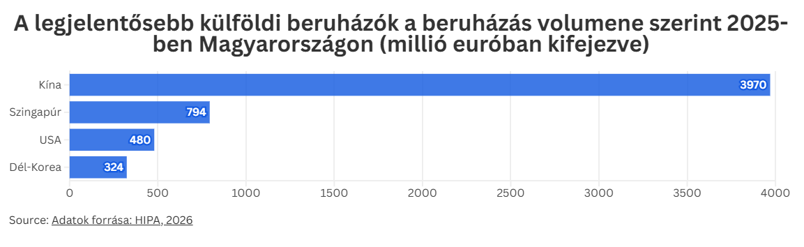 2025-ben a legjelentősebb beruházók Magyarországon a beruházási volumen szerint Kína (3 970 millió euró) és Szingapúr volt (794 millió euró), továbbá Dél-Korea (324 millió euró) is befért az első ötbe. Ez is jól mutatja, hogy a keleti nyitás politikája 2025-ben is komoly sikert hozott a beruházásösztönzésben.
