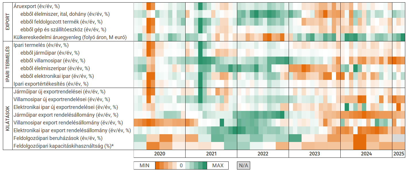 Megjegyzés: A külgazdasági hőtérkép a magyar gazdaság fontosabb, exportteljesítményhez kapcsolódó mutatóinak alakulását együttesen szemlélteti, oly módon, hogy – a változás mértékétől függően – a növekedést a zöld árnyalatai, a csökkenést pedig a narancssárga árnyalatai jelzik. A színskála minden változó esetében a saját éves változásuk minimuma és maximuma között rajzolódik ki.
