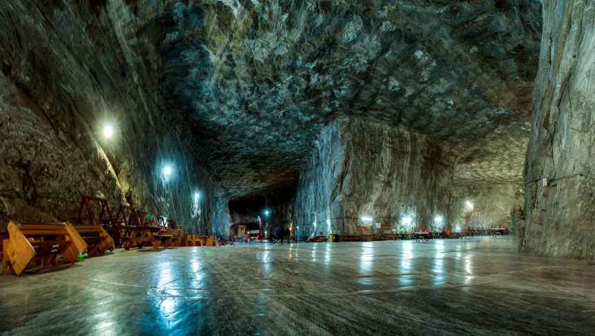 A parajdi sóbánya egyik lélegzetelállító csarnoka 2018-ban. Monumentális méreteinek, évszázados történelmének és gyógyító levegőjének köszönhetően rendkívüli turisztikai látványosságnak számított a székelyföldi sóbánya. - Kép forrása: Shutterstock
